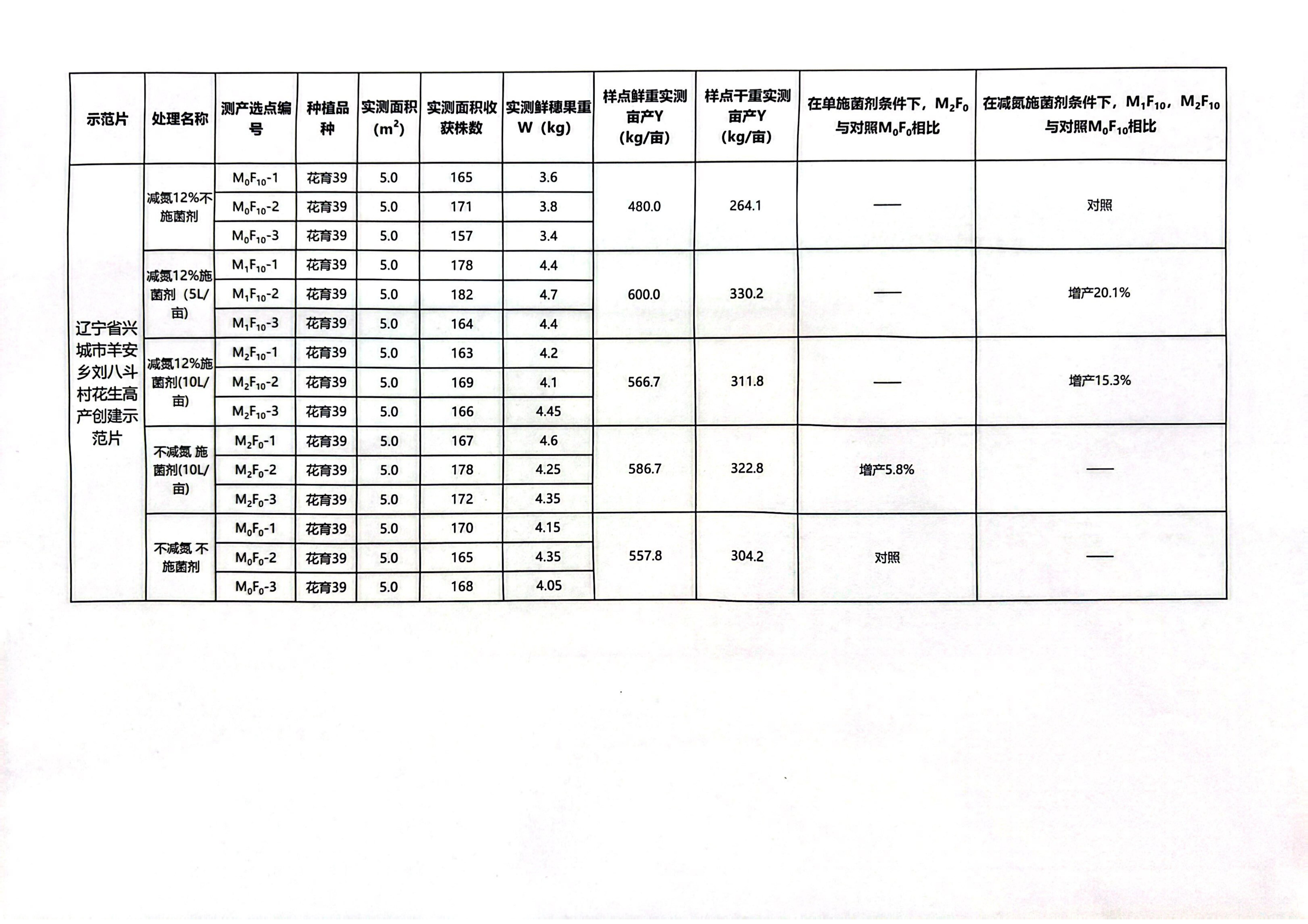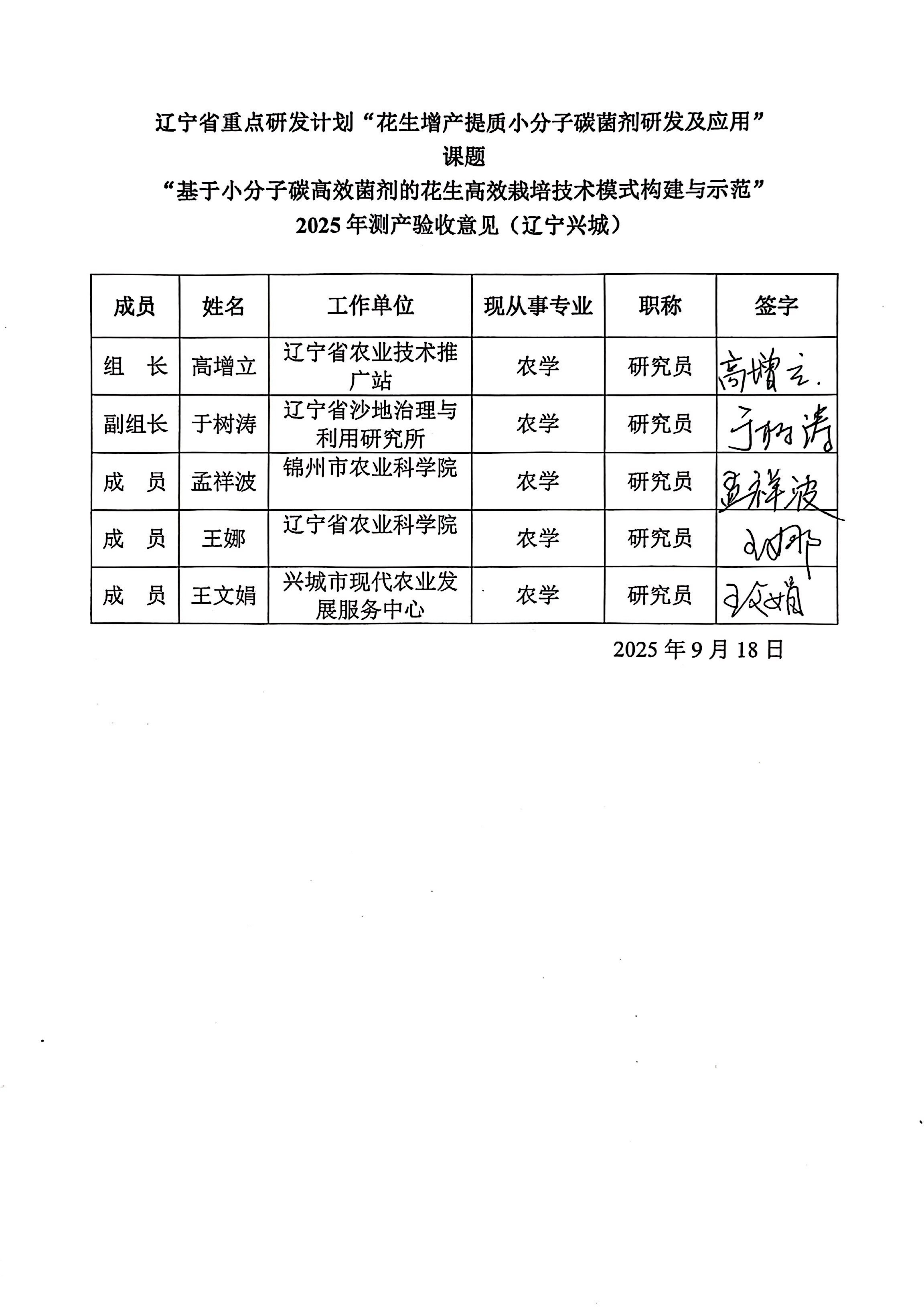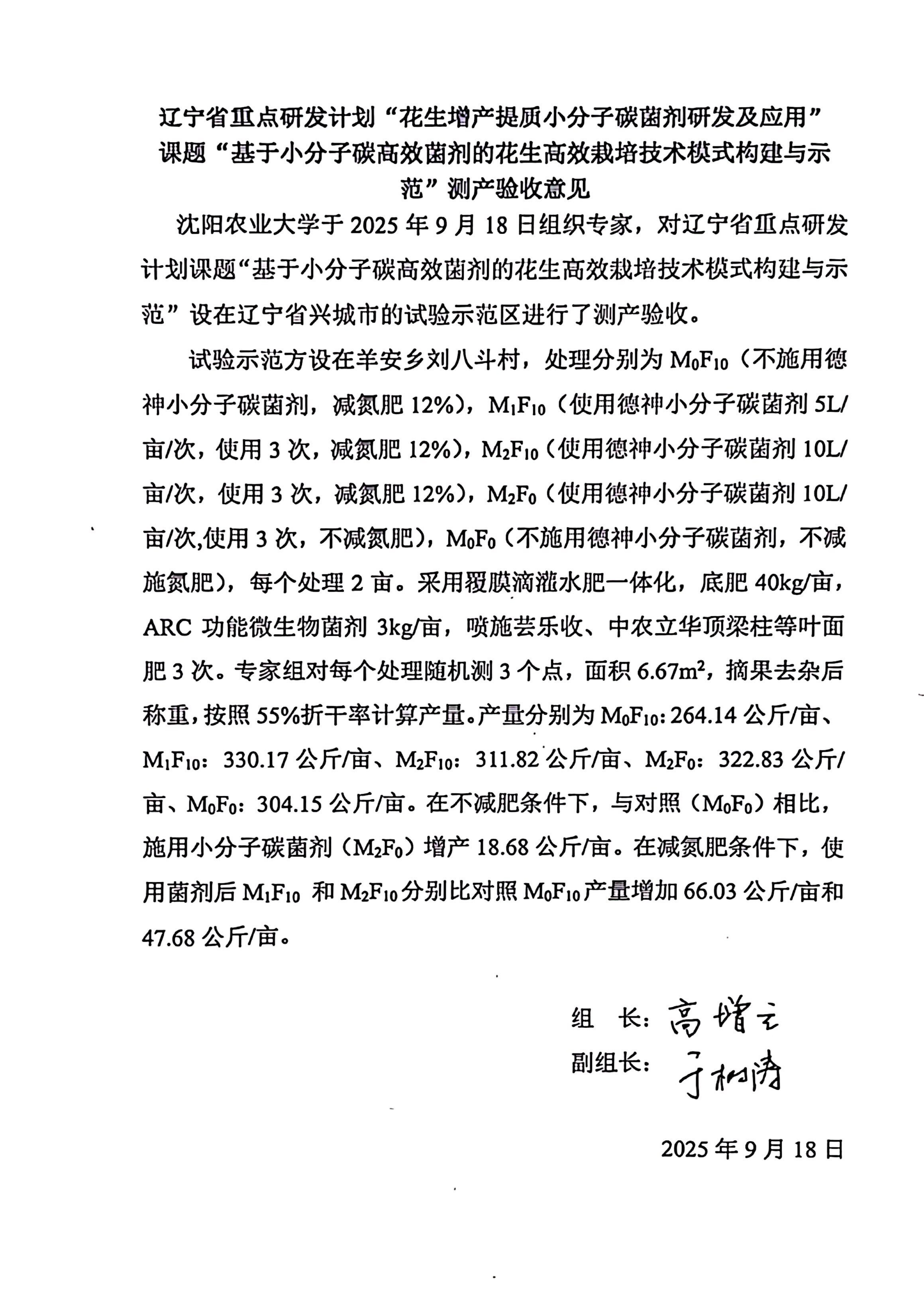 辽宁省重点研发计划“花生增产提质小分子碳菌剂研发及应用” 课题“基于小分子碳高效菌剂的花生高效栽培技术模式构建与示 范”测产验收意见